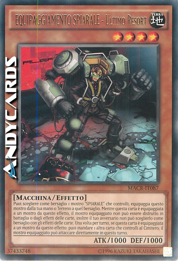 Puoi scegliere come bersaglio 1 mostro "SPIARALE" che controlli; equipaggia questo mostro dalla tua mano o Terreno a quel bersaglio. Mentre questa carta è equipaggiata a un mostro da questo effetto, il mostro equipaggiato non può essere distrutto in battaglia o dagli effetti delle carte, inoltre il tuo avversario non può sceglierlo come bersaglio con gli effetti delle carte. Una volta per turno, se questa carta è equipaggiata a un mostro da questo effetto: puoi mandare 1 altra carta che controlli al Cimitero; il mostro equipaggiato può attaccare direttamente in questo turno.