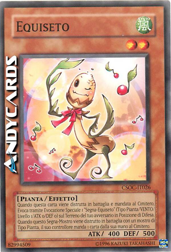 Quando questa carta viene distrutta in battaglia e mandata al Cimitero, Evoca tramite Evocazione Speciale 1 “Segna-Equiseto” (Tipo Pianta/VENTO/Livello 1/ATK 0/DEF 0) sul Terreno del tuo avversario in Posizione di Difesa. Quando questo Segna-Mostro viene distrutto in battaglia con un mostro di Tipo Pianta, il suo controllore manda 1 carta dalla sua mano al Cimitero.