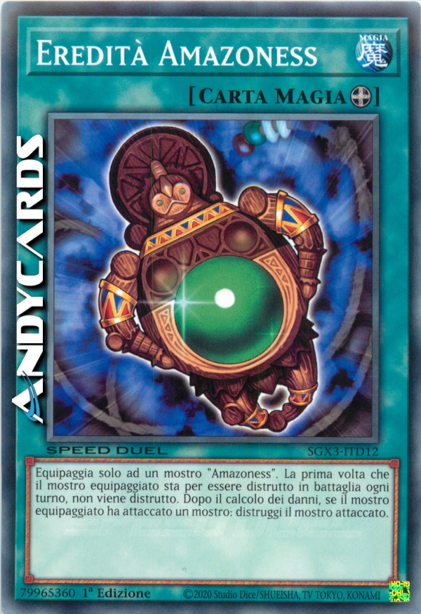 Equipaggia solo ad un mostro "amazzoness".Una volta per turno,quel mostro non può essere distrutto in battaglia.Quando il mostro equipaggiato attacca,dopo il calcolo dei danni,distruggi il bersaglio dell'attacco.
