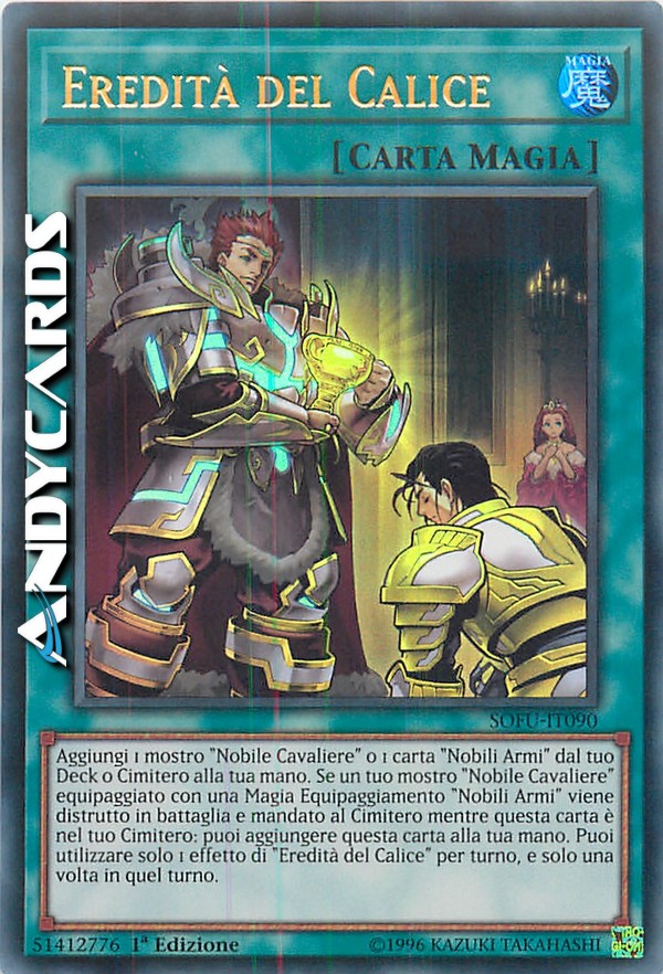 Aggiungi 1 mostro "Nobile Cavaliere" o 1 carta "Nobili Armi" dal tuo Deck o Cimitero alla tua mano. Se un tuo mostro "Nobile Cavaliere" equipaggiato con una Magia Equipaggiamento "Nobili Armi" viene distrutto in battaglia e mandato al Cimitero mentre questa carta è nel tuo Cimitero: puoi aggiungere questa carta alla tua mano. Puoi utilizzare solo 1 effetto di "Eredità del Calice" per turno, e solo una volta in quel turno.
