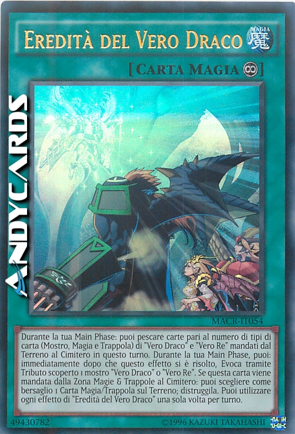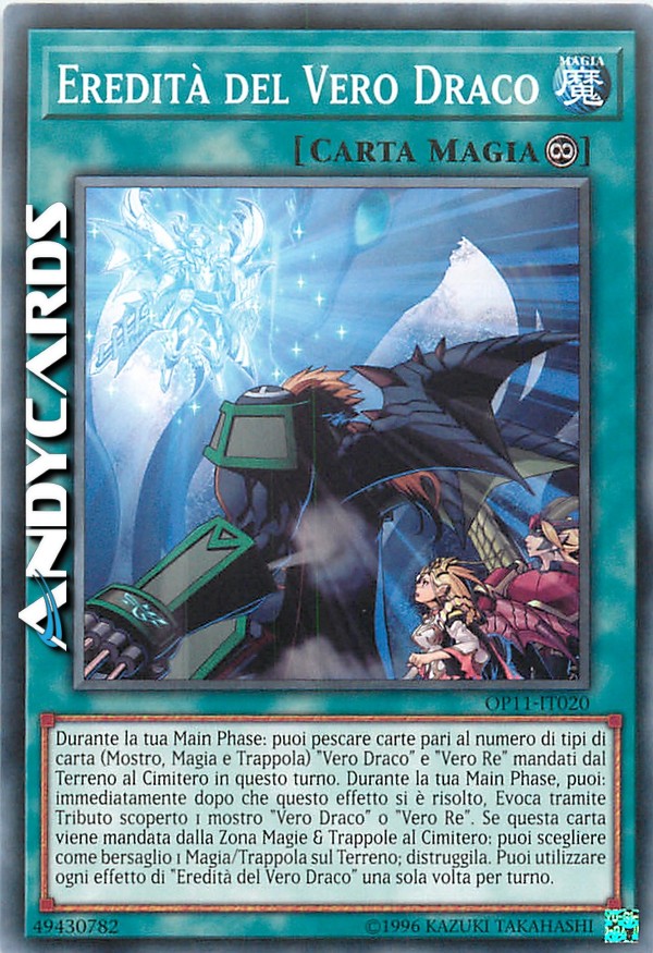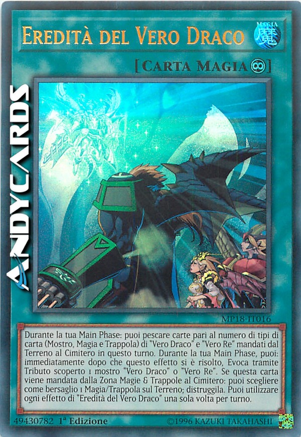 Durante la tua Main Phase: puoi pescare carte pari al numero di tipi di carta (Mostro, Magia e Trappola) di "Vero Draco" e "Vero Re" mandati dal Terreno al Cimitero in questo turno. Durante la tua Main Phase, puoi: immediatamente dopo che questo effetto si è risolto, Evoca tramite Tributo scoperto 1 mostro "Vero Draco" o "Vero Re". Se questa carta viene mandata dalla Zona Magie & Trappole al Cimitero: puoi scegliere come bersaglio 1 Carta Magia/Trappola sul Terreno; distruggila. Puoi utilizzare ogni effetto di "Eredità del Vero Draco" una sola volta per turno.