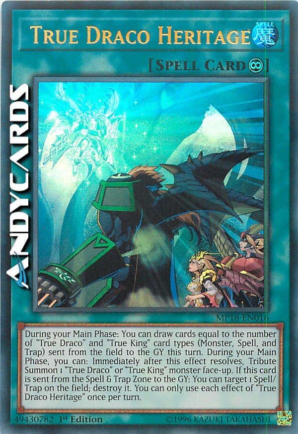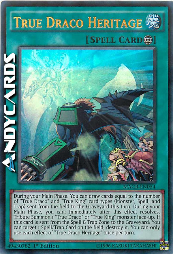 During your Main Phase: You can draw cards equal to the number of "True Draco" and "True King" card types (Monster, Spell, and Trap) sent from the field to the Graveyard this turn. During your Main Phase, you can: Immediately after this effect resolves, Tribute Summon 1 "True Draco" or "True King" monster face-up. If this card is sent from the Spell & Trap Zone to the Graveyard: You can target 1 Spell/Trap Card on the field; destroy it. You can only use each effect of "True Draco Heritage" once per turn.