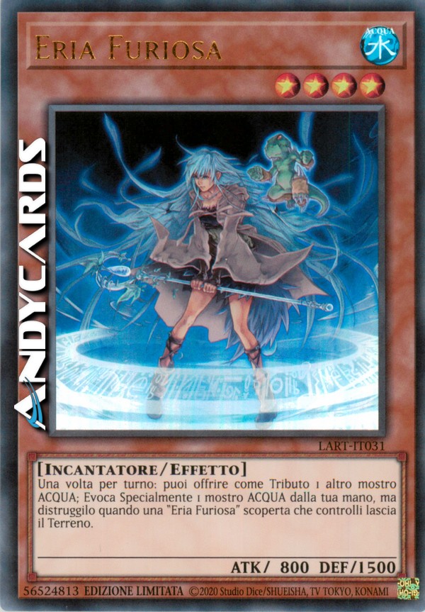 Una volta per turno, offrendo come Tributo 1 mostro ACQUA sul tuo Terreno (eccetto questa carta), Evoca tramite Evocazione Speciale 1 mostro ACQUA dalla tua mano. Il mostro Evocato tramite Evocazione Speciale per questo effetto viene distrutto se "Eria Furiosa" viene rimossa dal tuo Terreno.