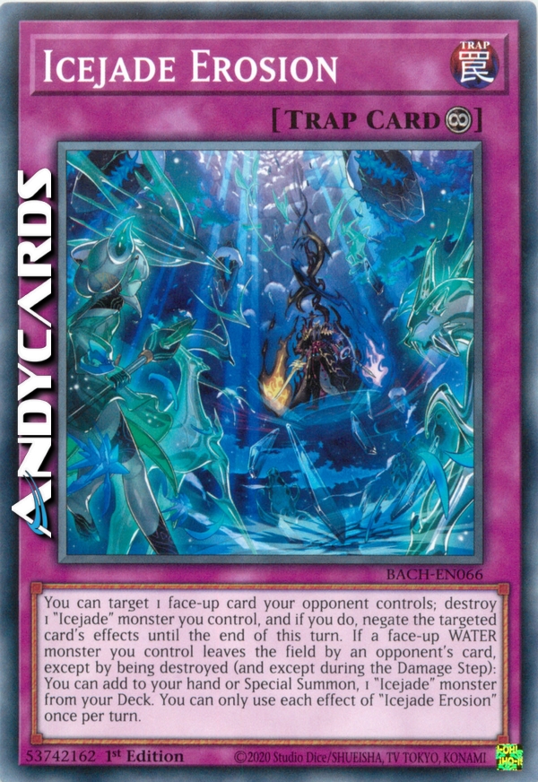 You can target 1 face-up card your opponent controls; destroy 1 "Icejade" monster you control, and if you do, negate the targeted card's effects until the end of this turn. If a face-up WATER monster you control leaves the field by an opponent's card, except by being destroyed (and except during the Damage Step): You can add to your hand or Special Summon, 1 "Icejade" monster from your Deck. You can only use each effect of "Icejade Erosion" once per turn.