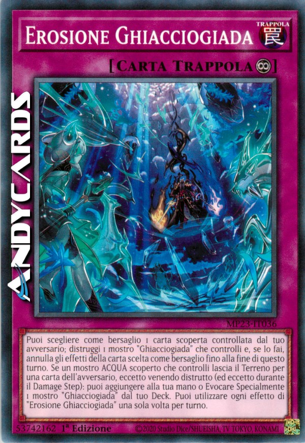 Puoi scegliere come bersaglio 1 carta scoperta controllata dal tuo avversario; distruggi 1 mostro "Ghiacciogiada" che controlli e, se lo fai, annulla gli effetti della carta scelta come bersaglio fino alla fine di questo turno. Se un mostro ACQUA scoperto che controlli lascia il Terreno per una carta dell'avversario, eccetto venendo distrutto (ed eccetto durante il Damage Step): puoi aggiungere alla tua mano o Evocare Specialmente 1 mostro "Ghiacciogiada" dal tuo Deck. Puoi utilizzare ogni effetto di "Erosione Ghiacciogiada" una sola volta per turno.