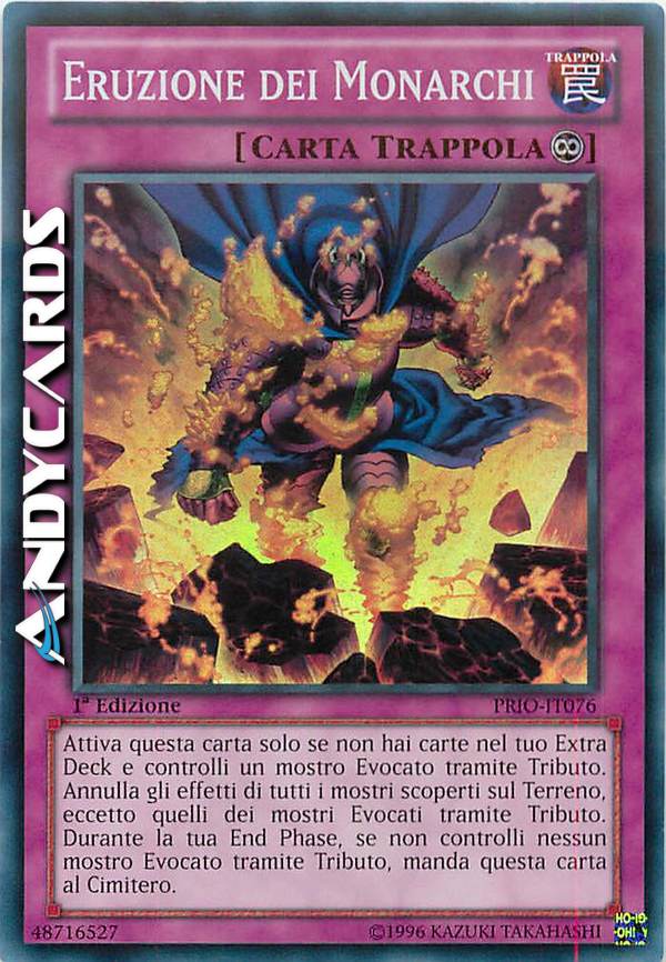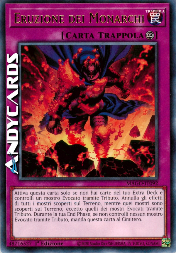 Attiva questa carta solo se non hai carte nel tuo Extra Deck e controlli un mostro evocato tramite Tributo. Annulla gli effetti di tutti i mostri scoperti sul terreno, eccetto quelli dei mostri Evocati tramite tributo. Durante la tua End Phase, se non controlli nessun mostro Evocato tramite Tributo, manda questa carta al Cimitero.