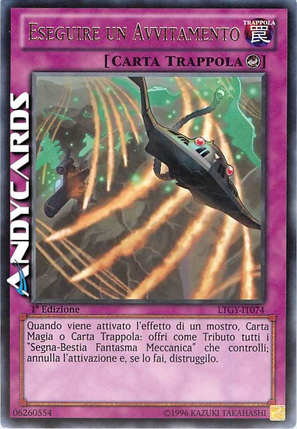 Quando viene attivato l'effetto di un mostr, Carta Magia o Carta Trappola: offri come Tributo tutti i "Segna-Bestia Fantasma Meccanica" che controlli; annulla l'attivcazione e, se lo fai, distruggilo.