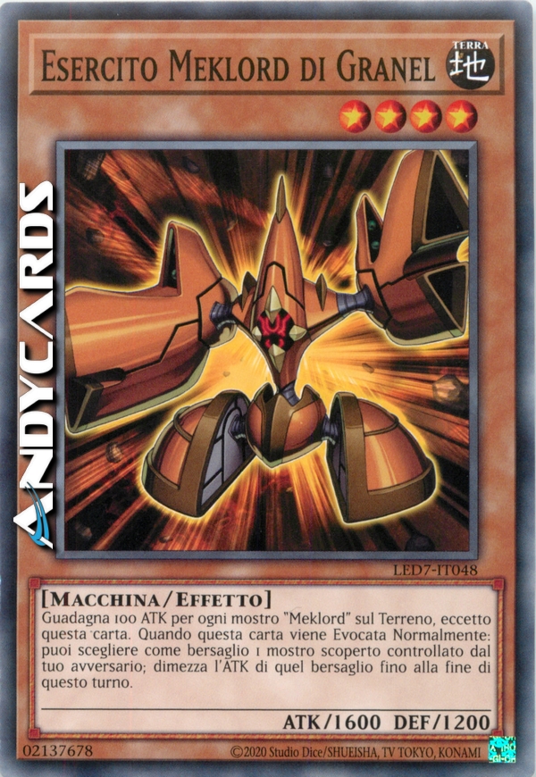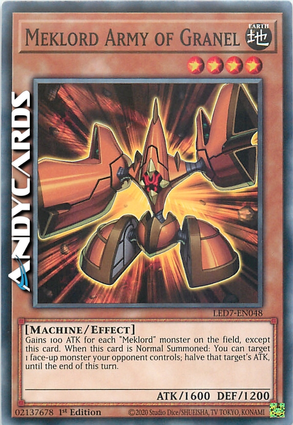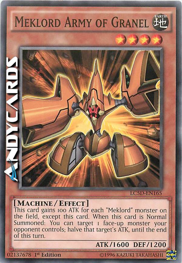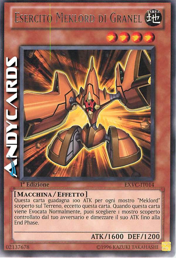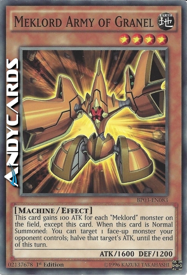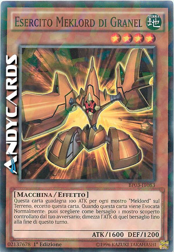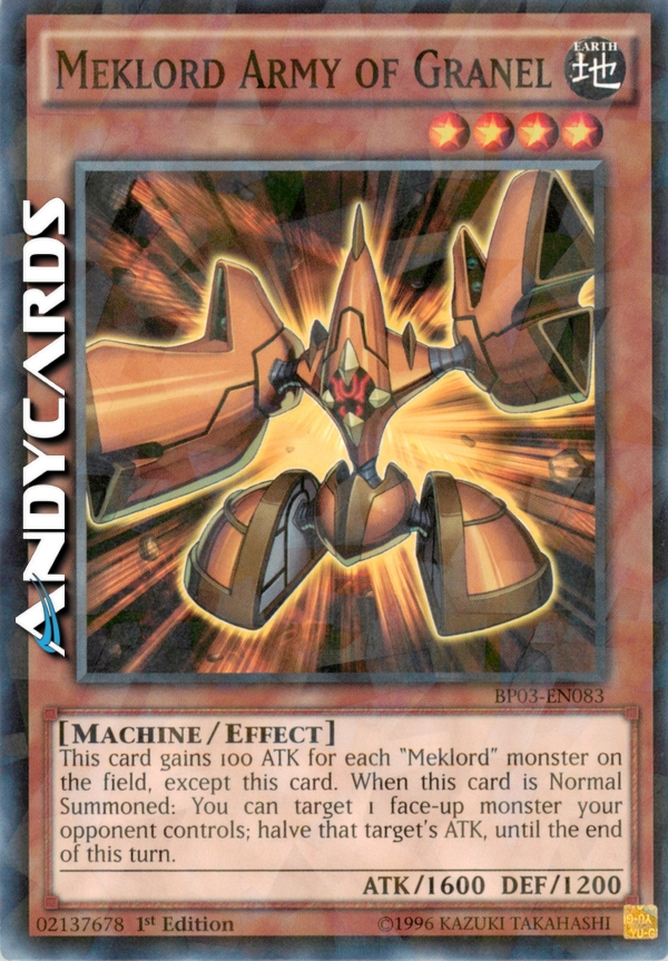 Guadagna 100 ATK per ogni mostro "Meklord" sul Terreno, eccetto questa carta. Quando questa carta viene Evocata Normalmente: puoi scegliere come bersaglio 1 mostro scoperto controllato dal tuo avversario; dimezza l'ATK di quel bersaglio fino alla fine di questo turno.