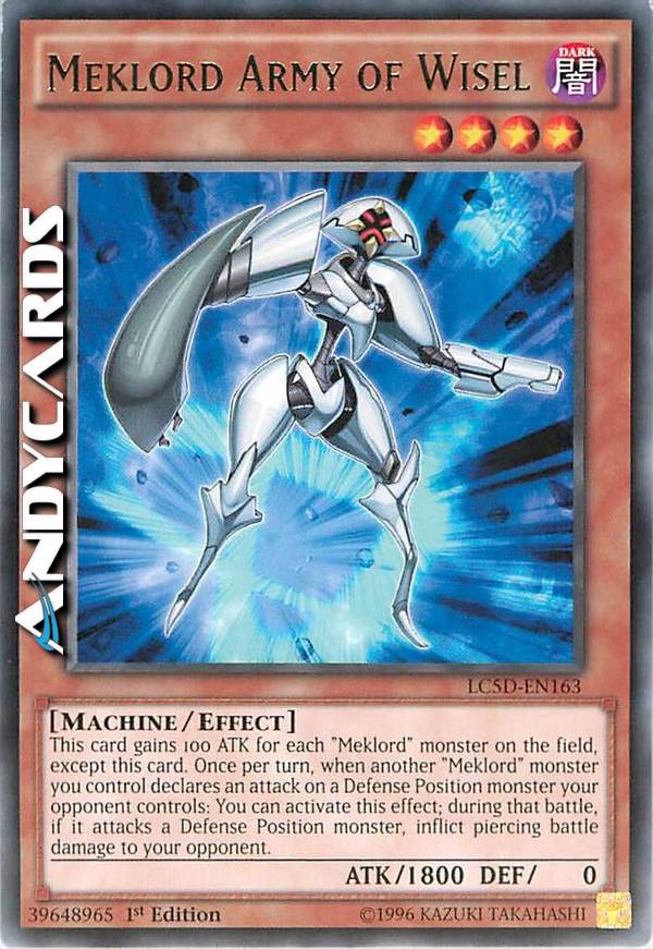 Guadagna 100 ATK per ogni mostro "Meklord" sul Terreno, eccetto questa carta. Una volta per turno, quando un altro mostro "Meklord" che controlli dichiara un attacco contro un mostro in Posizione di Difesa: puoi attivare questo effetto; durante quella battaglia, se esso attacca un mostro in Posizione di Difesa, infliggi danno da combattimento perforante al tuo avversario.