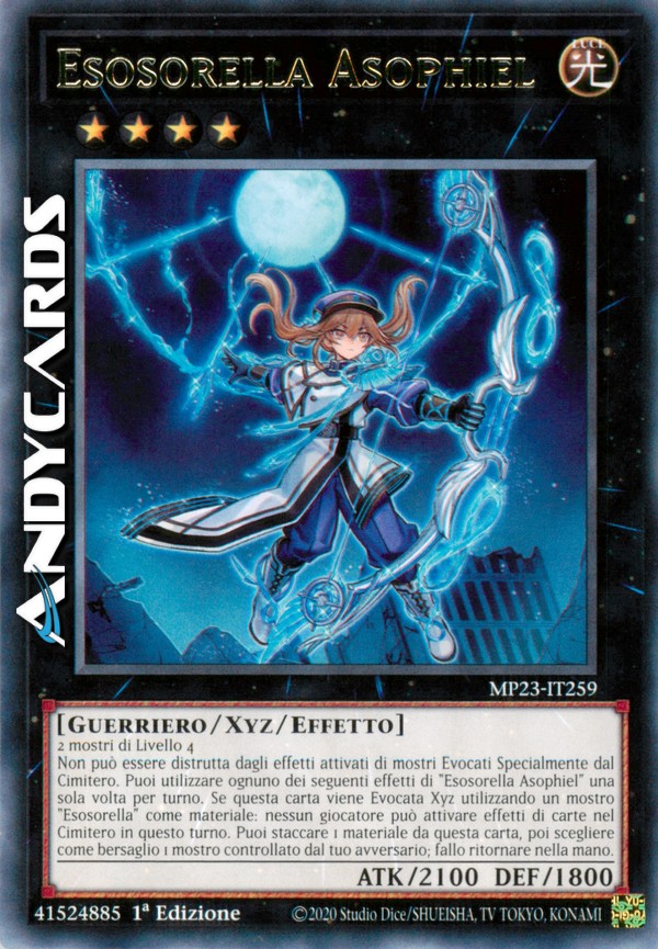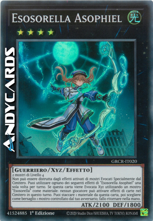 Non può essere distrutta dagli effetti attivati di mostri Evocati Specialmente dal Cimitero. Puoi utilizzare ognuno dei seguenti effetti di "Esosorella Asophiel" una sola volta per turno. Se questa carta viene Evocata Xyz utilizzando un mostro "Esosorella" come materiale: nessun giocatore può attivare effetti di carte nel Cimitero in questo turno. Puoi staccare 1 materiale da questa carta, poi scegliere come bersaglio 1 mostro controllato dal tuo avversario; fallo ritornare nella mano.