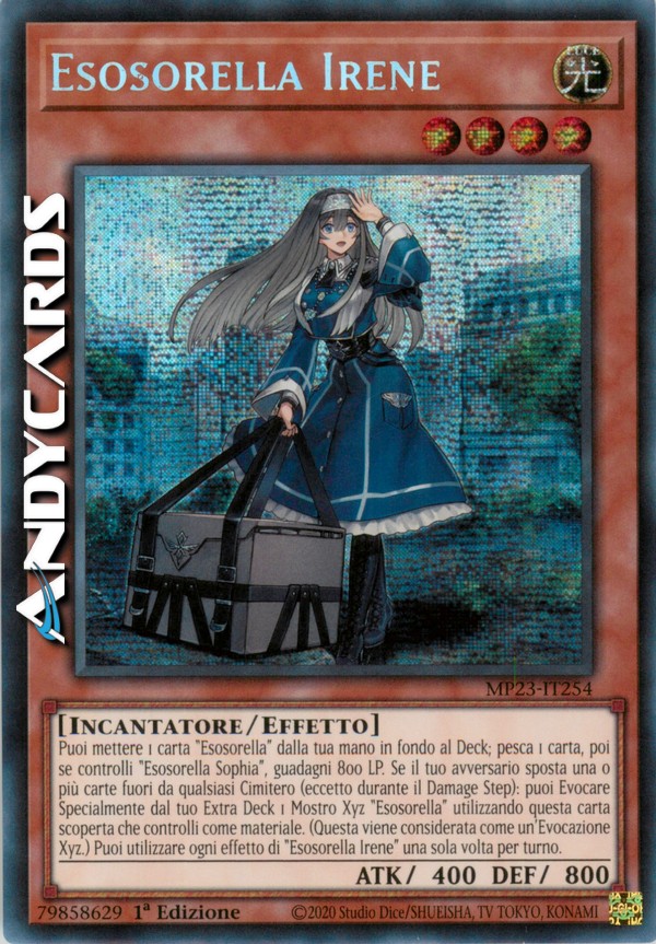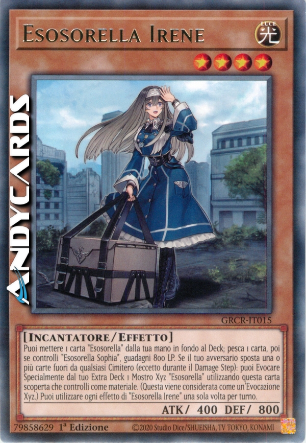 Puoi mettere 1 carta "Esosorella" dalla tua mano in fondo al Deck; pesca 1 carta, poi se controlli "Esosorella Sophia", guadagni 800 LP. Se il tuo avversario sposta una o più carte fuori da qualsiasi Cimitero (eccetto durante il Damage Step): puoi Evocare Specialmente dal tuo Extra Deck 1 Mostro Xyz "Esosorella" utilizzando questa carta scoperta che controlli come materiale. (Questa viene considerata come un'Evocazione Xyz.) Puoi utilizzare ogni effetto di "Esosorella Irene" una sola volta per turno.