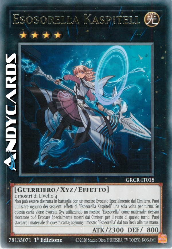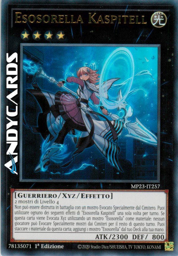 Non può essere distrutta in battaglia con un mostro Evocato Specialmente dal Cimitero. Puoi utilizzare ognuno dei seguenti effetti di "Esosorella Kaspitell" una sola volta per turno. Se questa carta viene Evocata Xyz utilizzando un mostro "Esosorella" come materiale: nessun giocatore può Evocare Specialmente mostri dai Cimiteri per il resto di questo turno. Puoi staccare 1 materiale da questa carta; aggiungi 1 mostro "Esosorella" dal tuo Deck alla tua mano.