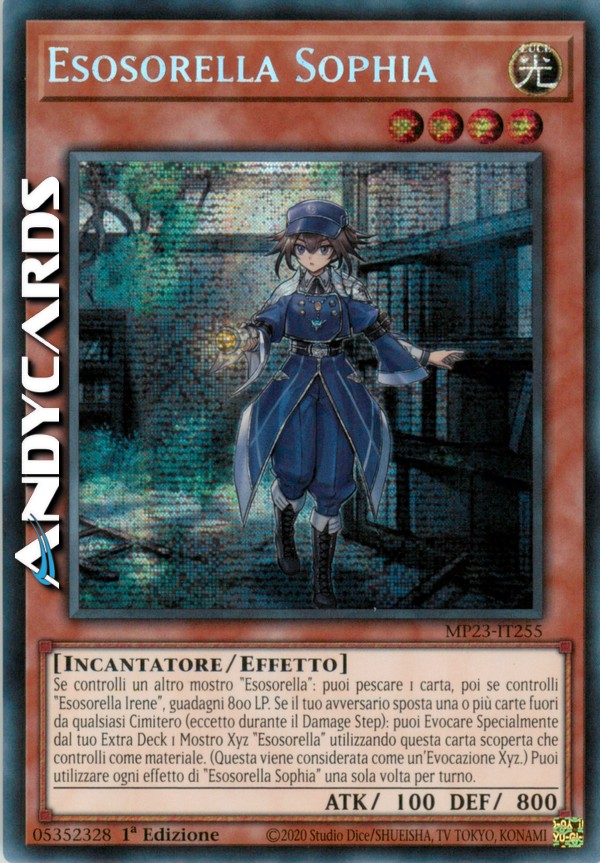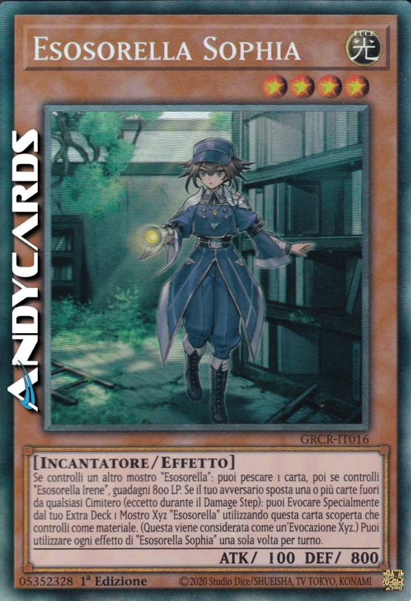 Se controlli un altro mostro "Esosorella": puoi pescare 1 carta, poi se controlli "Esosorella Irene", guadagni 800 LP. Se il tuo avversario sposta una o più carte fuori da qualsiasi Cimitero (eccetto durante il Damage Step): puoi Evocare Specialmente dal tuo Extra Deck 1 Mostro Xyz "Esosorella" utilizzando questa carta scoperta che controlli come materiale. (Questa viene considerata come un'Evocazione Xyz.) Puoi utilizzare ogni effetto di "Esosorella Sophia" una sola volta per turno.