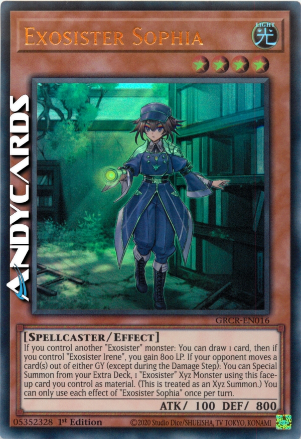 If you control another "Exosister" monster: You can draw 1 card, then if you control "Exosister Irene", you gain 800 LP. If your opponent moves a card(s) out of either GY (except during the Damage Step): You can Special Summon from your Extra Deck, 1 "Exosister" Xyz Monster using this face-up card you control as material. (This is treated as an Xyz Summon.) You can only use each effect of "Exosister Sophia" once per turn.
