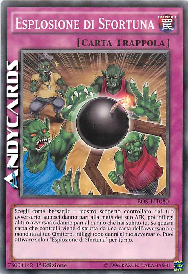 Scegli come bersaglio 1 mostro scoperto controllato dal tuo avversario; subisci danno pari alla metà del suo ATK, poi infliggi al tuo avversario danno pari al danno che hai subito tu. Se questa carta che controlli viene distrutta da una carta dell'avversario e mandata al tuo Cimitero: infliggi 1000 danni al tuo avversario. Puoi attivare solo 1 "Esplosione di Sfortuna" per turno.