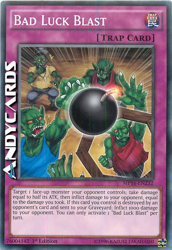 Target 1 face-up monster your opponent controls; take damage equal to half its ATK, then inflict damage to your opponent, equal to the damage you took. If this card youcontrol is destroyed by an opponent's card and sent to your Graveyard: Inflict 1000 damage to your opponent. You can only activate 1 "Bad Luck Blast" per turn.