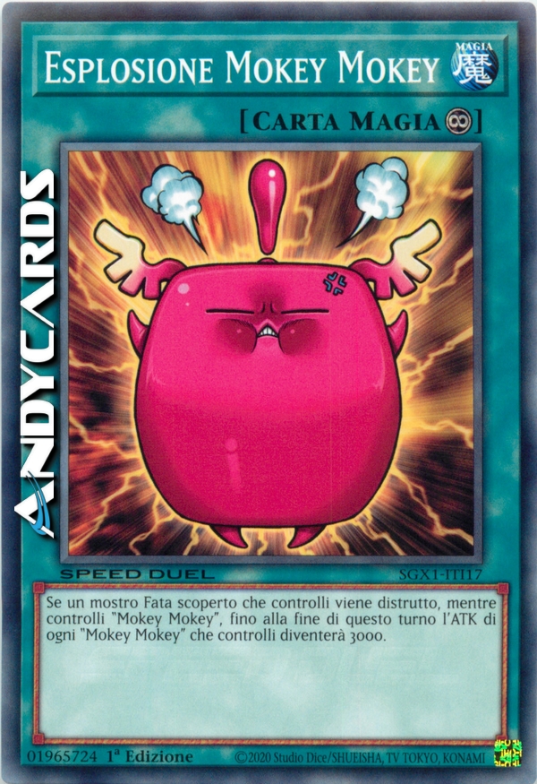 Quando c'è un "Mokey Mokey" scoperto sul tuo Terreno, se un mostro di Tipo Fata sul tuo Terreno viene distrutto, l'ATK dei "Mokey Mokey" sul tuo Terreno diventa 3000 fino alla End Phase di questo turno.