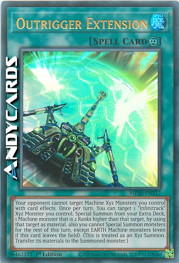 Il tuo avversario non può scegliere Mostri Xyz Macchina che tu controlli come bersaglio con gli effetti delle carte. Una volta per turno: puoi scegliere come bersaglio 1 Mostro Xyz "Infinicingoli" che controlli; Evoca Specialmente dal tuo Extra Deck 1 mostro Macchina di 2 Ranghi superiore a quel bersaglio, utilizzando il bersaglio come materiale, inoltre non puoi Evocare Specialmente mostri per il resto di questo turno, eccetto mostri TERRA Macchina (anche se questa carta lascia il Terreno). (Questa viene considerata come un'Evocazione Xyz. Trasferisci i suoi materiali sul mostro Evocato.)