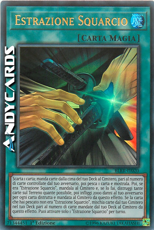 Scarta 1 carta; manda carte dalla cima del tuo Deck al Cimitero, pari al numero di carte controllate dal tuo avversario, poi pesca 1 carta e mostrala. Poi, se era "Estrazione Squarcio", mandala al Cimitero e, se lo fai, distruggi tante carte sul Terreno quante possibile, poi infliggi 2000 danni al tuo avversario per ogni carta distrutta e mandata al Cimitero da questo effetto. Se la carta che hai pescato non era "Estrazione Squarcio", mischia carte dal tuo Cimitero nel tuo Deck pari al numero di carte mandate dal tuo Deck al Cimitero da questo effetto. Puoi attivare solo 1 "Estrazione Squarcio" per turno.