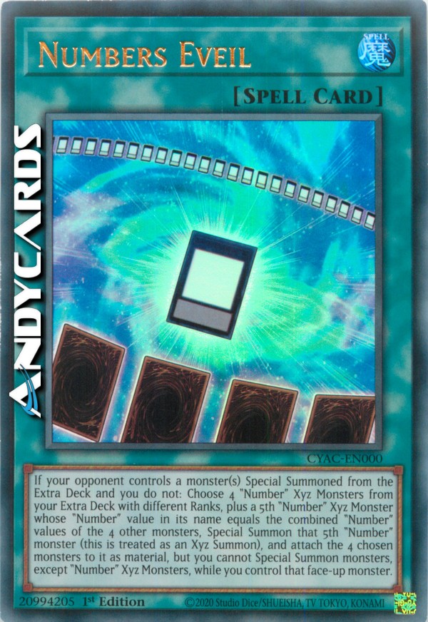 If your opponent controls a monster(s) Special Summoned from the Extra Deck and you do not: Choose 4 "Number" Xyz Monsters from your Extra Deck with different Ranks, plus a 5th "Number" Xyz Monster whose "Number" value in its name equals the combined "Number" values of the 4 other monsters, Special Summon that 5th "Number" monster (this is treated as an Xyz Summon), and attach the 4 chosen monsters to it as material, but you cannot Special Summon monsters, except "Number" Xyz Monsters, while you control that face-up monster.