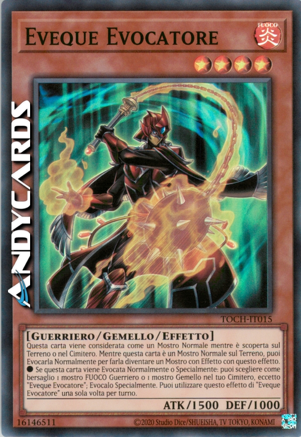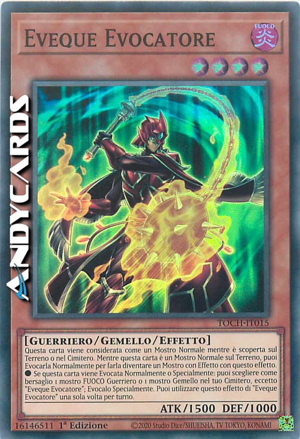 ?Se questa carta viene Evocata Normalmente o Specialmente: puoi scegliere come bersaglio 1 mostro FUOCO Guerriero o 1 mostro Gemello nel tuo Cimitero, eccetto "Eveque Evocatore"; Evocalo Specialmente. Puoi utilizzare questo effetto di "Eveque Evocatore" una sola volta per turno.