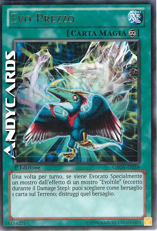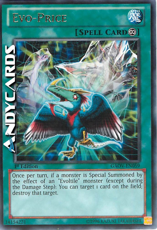 Una volta per turno, se viene Evocato Specialmente un mostro dall'effetto di un mostro "Evoltile" (eccetto durante il Damage Step): puoi scegliere come bersaglio 1 carta sul Terreno; distruggi quel bersaglio.