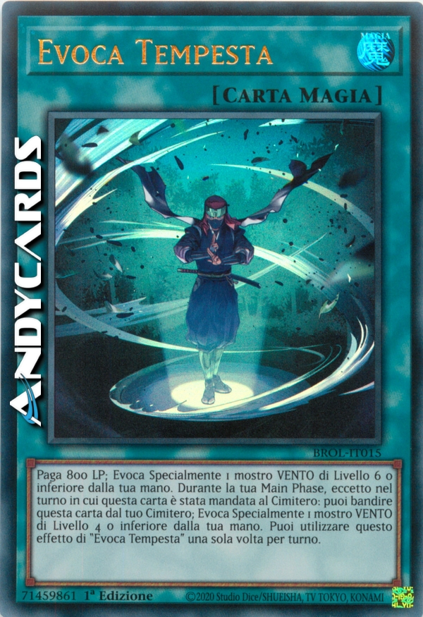 Paga 800 LP; Evoca Specialmente 1 mostro VENTO di Livello 6 o inferiore dalla tua mano. Durante la tua Main Phase, eccetto nel turno in cui questa carta è stata mandata al Cimitero: puoi bandire questa carta dal tuo Cimitero; Evoca Specialmente 1 mostro VENTO di Livello 4 o inferiore dalla tua mano. Puoi utilizzare questo effetto di "Evoca Tempesta" una sola volta per turno.