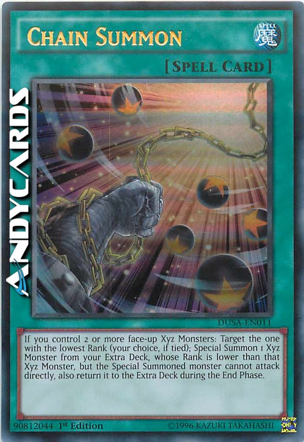 If you control 2 or more face-up Xyz Monsters: Target the one with the lowest Rank (your choice, if tied); Special Summon 1 Xyz Monster from your Extra Deck, whose Rank is lower than that Xyz Monster, but the Special Summoned monster cannot attack directly, also return it to the Extra Deck during the End Phase.