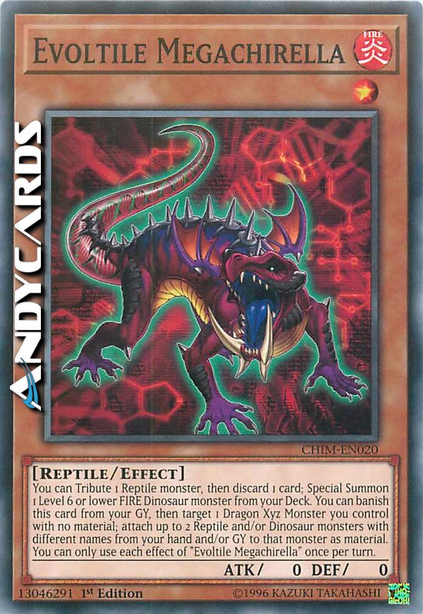 Puoi offrire come Tributo 1 mostro Rettile, poi scartare 1 carta; Evoca Specialmente 1 mostro FUOCO Dinosauro di Livello 6 o inferiore dal tuo Deck. Puoi bandire questa carta dal tuo Cimitero, poi scegliere come bersaglio 1 Mostro Xyz Drago che controlli senza materiali; attacca fino a 2 mostri Rettile e/o Dinosauro con nomi diversi dalla tua mano e/o Cimitero a quel mostro come materiale. Puoi utilizzare ogni effetto di "Evoltile Megachirella" una sola volta per turno.