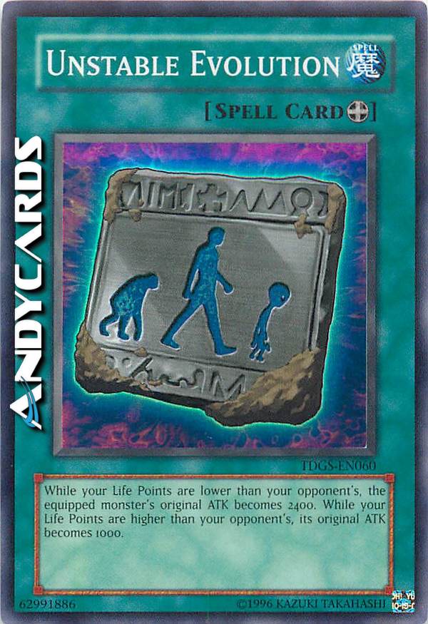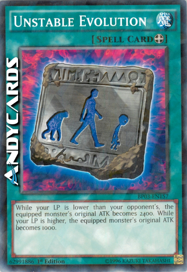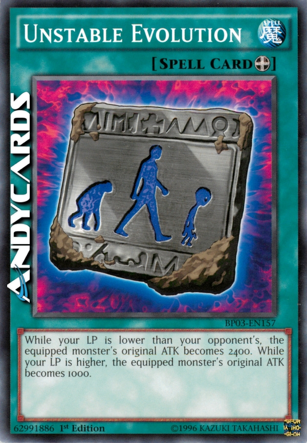 Fino a quando i tuoi Life Points sono inferiori a quelli del tuo avversario, l'ATK originale del mostro equipaggiato diventa 2400. Fino a quando i tuoi Life Points sono maggiori di quelli del tuo avversario, il suo ATK originale diventa 1000.