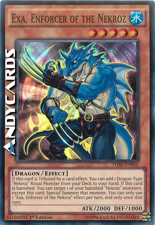 If this card is Tributed by a card effect: You can add 1 Dragon-Type "Nekroz" Ritual Monster from your Deck to your hand. If this card is banished: You can target 1 of your banished "Nekroz" monsters, except this card; Special Summon that monster. You can only use 1 "Exa, Enforcer of the Nekroz" effect per turn, and only once that turn.
