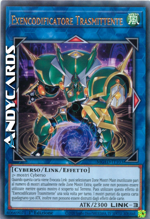 2+ mostri Cyberso Quando questa carta viene Evocata Link: puoi selezionare Zone Mostri Main inutilizzate pari al numero di mostri attualmente nelle Zone Mostri Extra; quelle zone non possono essere utilizzate mentre questo mostro è scoperto sul Terreno. Puoi utilizzare questo effetto di "Exencodificatore Trasmittente" una sola volta per turno. I mostri puntati da questa carta guadagnano 500 ATK, inoltre non possono essere distrutti dagli effetti delle carte.