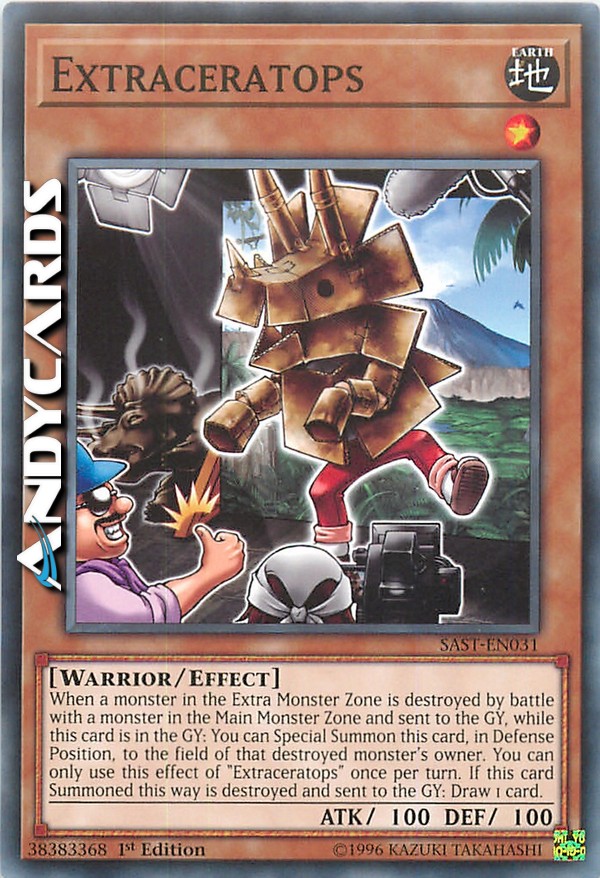 When a monster in the Extra Monster Zone is destroyed by battle with a monster in the Main Monster Zone and sent to the GY, while this card is in the GY: You can Special Summon this card, in Defense Position, to the field of that destroyed monster's owner. You can only use this effect of "Extraceratops" once per turn. If this card Summoned this way is destroyed and sent to the GY: Draw 1 card.