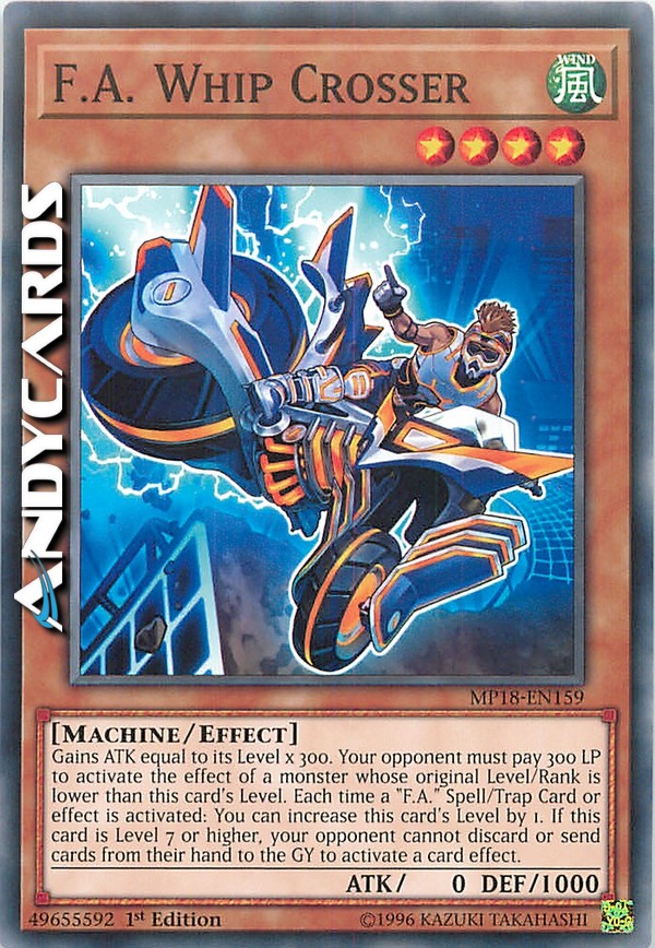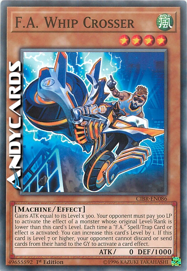 Gains ATK equal to its Level x 300. Your opponent must pay 300 LP to activate the effect of a monster whose original Level/Rank is lower than this card's Level. Each time a "F.A." Spell/Trap Card or effect is activated: You can increase this card's Level by 1. If this card is Level 7 or higher, your opponent cannot discard or send cards from their hand to the GY to activate a card effect.