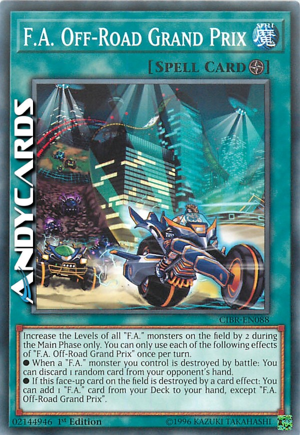Increase the Levels of all "F.A." monsters on the field by 2 during the Main Phase only. You can only use each of the following effects of "F.A. Off-Road Grand Prix" once per turn. - When a "F.A." monster you control is destroyed by battle: You can discard 1 random card from your opponent's hand. - If this face-up card on the field is destroyed by a card effect: You can add 1 "F.A." card from your Deck to your hand, except "F.A. Off-Road Grand Prix".