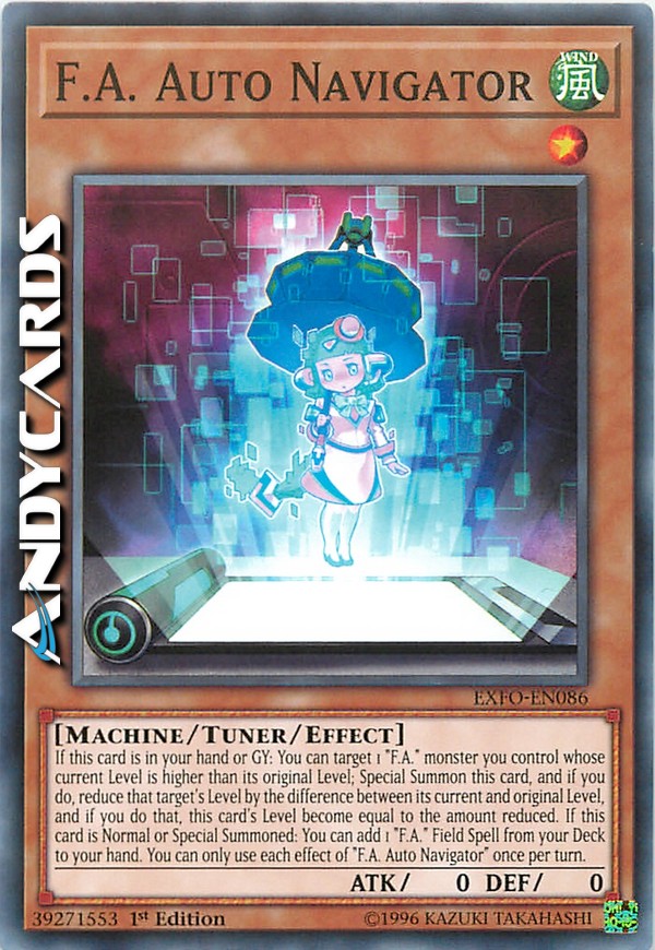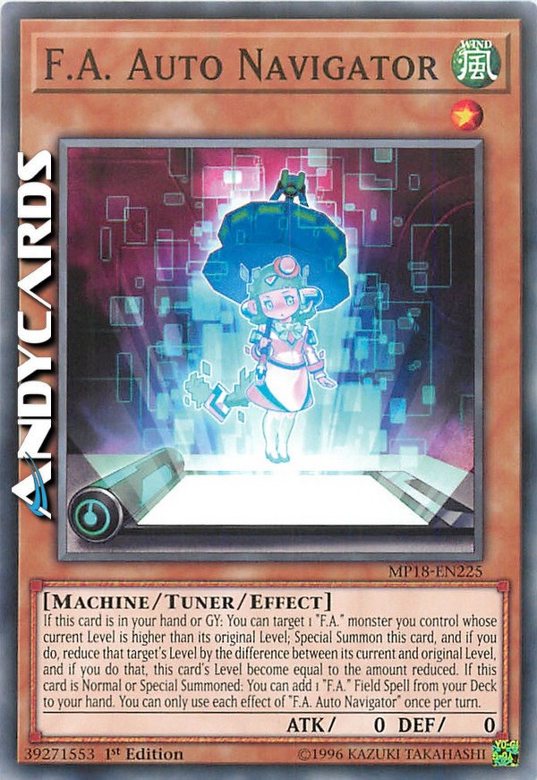If this card is in your hand or GY: You can target 1 "F.A." monster you control whose current Level is higher than its original Level; Special Summon this card, and if you do, reduce that target's Level by the difference between its current and original Level, and if you do that, this card's Level become equal to the amount reduced. If this card is Normal or Special Summoned: You can add 1 "F.A." Field Spell from your Deck to your hand. You can only use each effect of "F.A. Auto Navigator" once per turn.