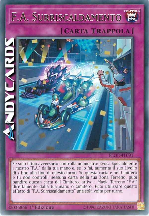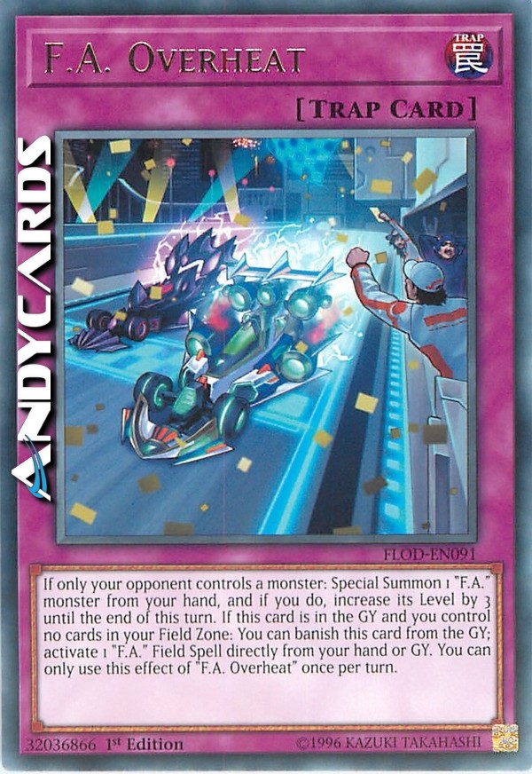 Se solo il tuo avversario controlla un mostro: Evoca Specialmente 1 mostro "F.A." dalla tua mano e, se lo fai, aumenta il suo Livello di 3 fino alla fine di questo turno. Se questa carta è nel Cimitero e tu non controlli nessuna carta nella tua Zona Terreno: puoi bandire questa carta dal Cimitero; attiva 1 Magia Terreno "F.A." direttamente dalla tua mano o Cimitero. Puoi utilizzare questo effetto di "F.A. Surriscaldamento" una sola volta per turno.