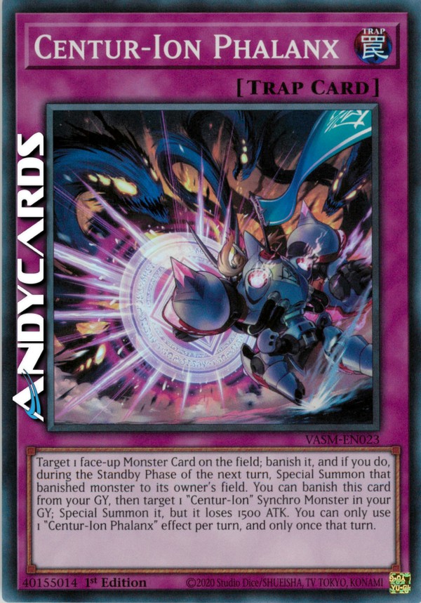 Target 1 face-up Monster Card on the field; banish it, and if you do, during the Standby Phase of the next turn, Special Summon that banished monster to its owner's field. You can banish this card from your GY, then target 1 "Centur-Ion" Synchro Monster in your GY; Special Summon it, but it loses 1500 ATK. You can only use 1 "Centur-Ion Phalanx" effect per turn, and only once that turn.