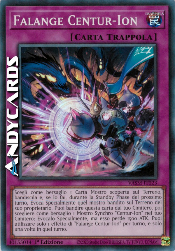Scegli come bersaglio 1 Carta Mostro scoperta sul Terreno; bandiscila e, se lo fai, durante la Standby Phase del prossimo turno, Evoca Specialmente quel mostro bandito sul Terreno del suo proprietario. Puoi bandire questa carta dal tuo Cimitero, poi scegliere come bersaglio 1 Mostro Synchro "Centur-Ion" nel tuo Cimitero; Evocalo Specialmente, ma esso perde 1500 ATK. Puoi utilizzare solo 1 effetto di "Falange Centur-Ion" per turno, e solo una volta in quel turno.