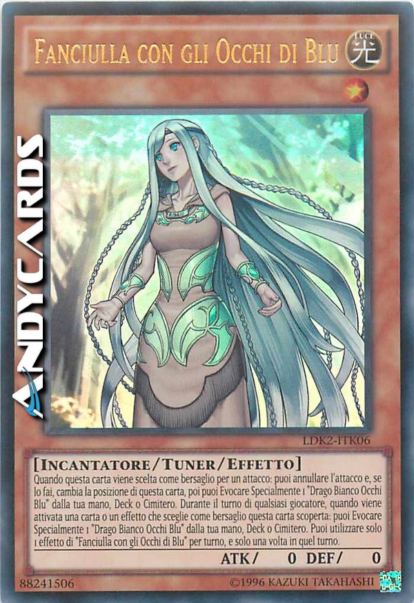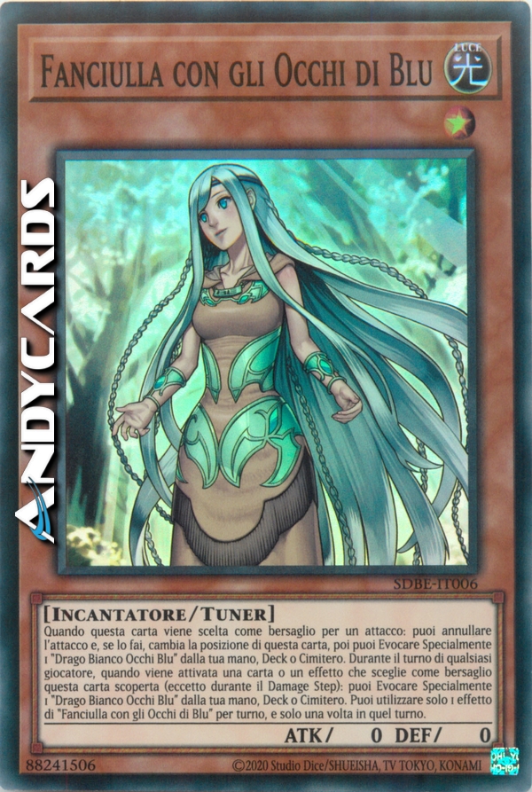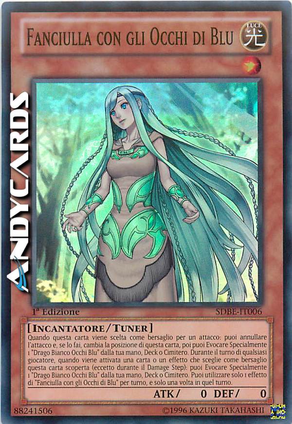 Quando viene attivata una carta o un effetto che sceglie come bersaglio questa carta (Effetto Rapido): puoi Evocare Specialmente 1 "Drago Bianco Occhi Blu" dalla tua mano, Deck o Cimitero. Quando questa carta viene scelta come bersaglio per un attacco: puoi annullare l'attacco e, se lo fai, cambia la posizione di questa carta, poi puoi Evocare Specialmente 1 "Drago Bianco Occhi Blu" dalla tua mano, Deck o Cimitero. Puoi utilizzare solo 1 effetto di "Fanciulla con gli Occhi di Blu" per turno, e solo una volta in quel turno.