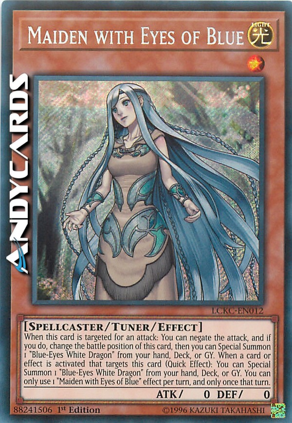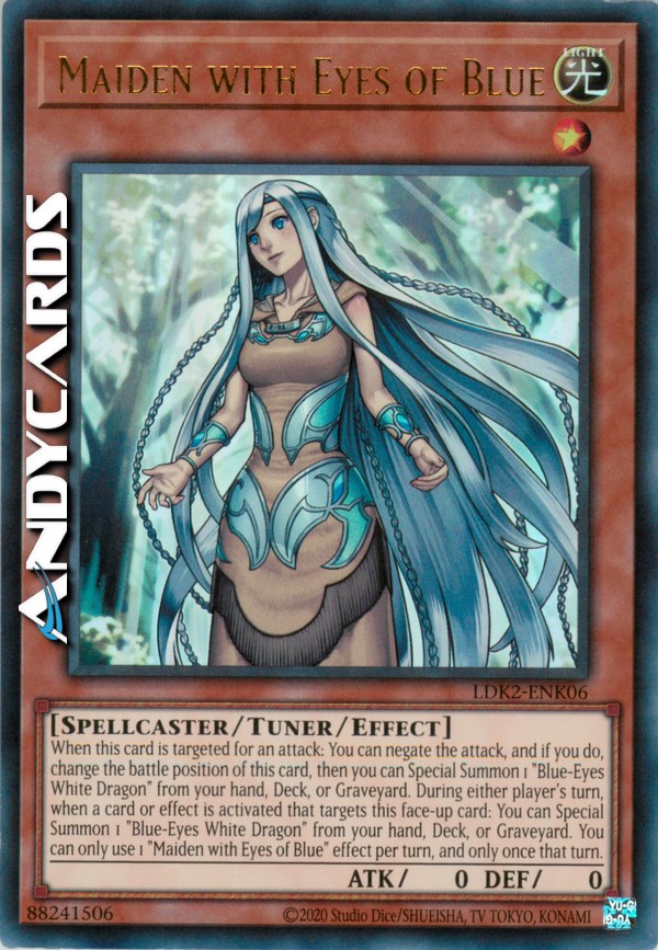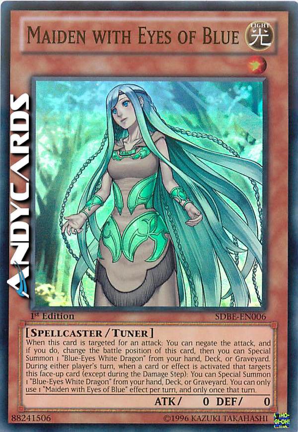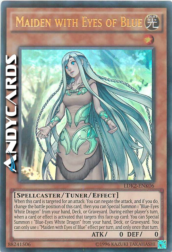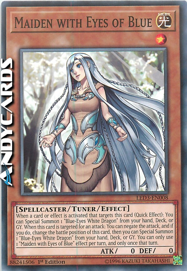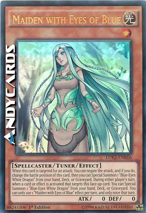 When a card or effect is activated that targets this card (Quick Effect): You can Special Summon 1 "Blue-Eyes White Dragon" from your hand, Deck, or GY. When this card is targeted for an attack: You can negate the attack, and if you do, change the battle position of this card, then you can Special Summon 1 "Blue-Eyes White Dragon" from your hand, Deck, or GY. You can only use 1 "Maiden with Eyes of Blue" effect per turn, and only once that turn.