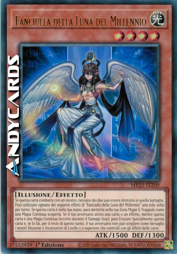 Se questa carta combatte con un mostro, nessuno dei due può essere distrutto in quella battaglia. Puoi utilizzare ognuno dei seguenti effetti di "Fanciulla della Luna del Millennio" una sola volta per turno. Se questa carta è nella tua mano: puoi metterla nella tua Zona Magie & Trappole come una Magia Continua scoperta. Se il tuo avversario attiva una carta o un effetto, mentre questa carta è una Magia Continua (eccetto durante il Damage Step): puoi Evocare Specialmente questa carta e, se lo fai, per il resto di questo turno, il tuo avversario non può scegliere come bersaglio i mostri Illusione o Incantatore di Livello 5 o superiore che controlli con gli effetti delle carte.