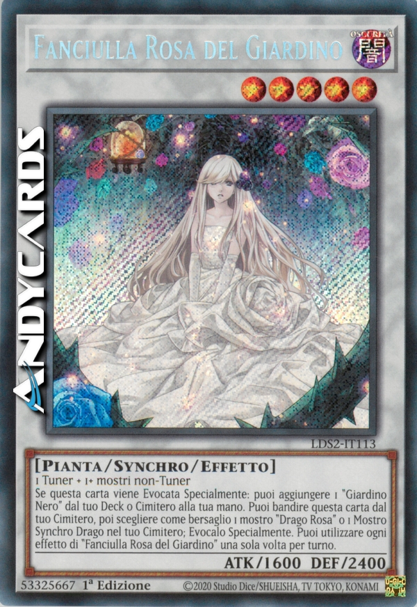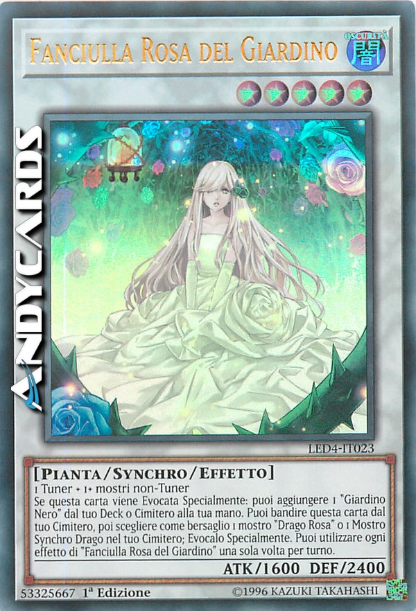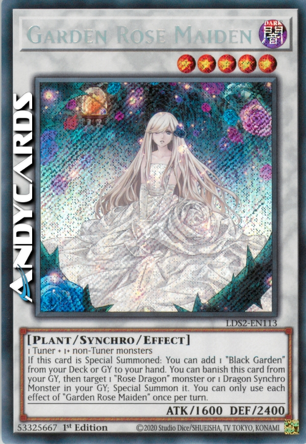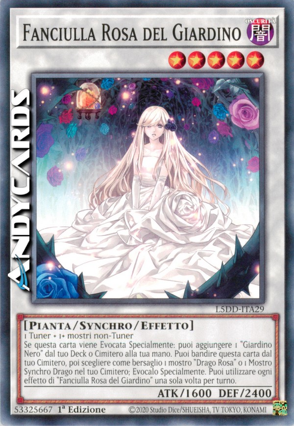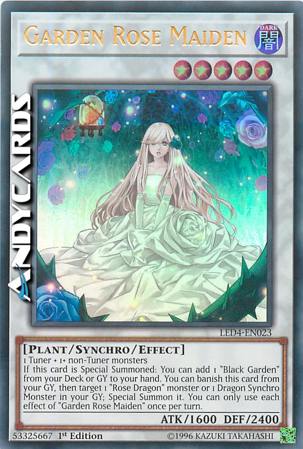 Se questa carta viene Evocata Specialmente: puoi aggiungere 1 "Giardino Nero" dal tuo Deck o Cimitero alla tua mano. Puoi bandire questa carta dal tuo Cimitero, poi scegliere come bersaglio 1 mostro "Drago Rosa" o 1 Mostro Synchro Drago nel tuo Cimitero; Evocalo Specialmente. Puoi utilizzare ogni effetto di "Fanciulla Rosa del Giardino" una sola volta per turno.