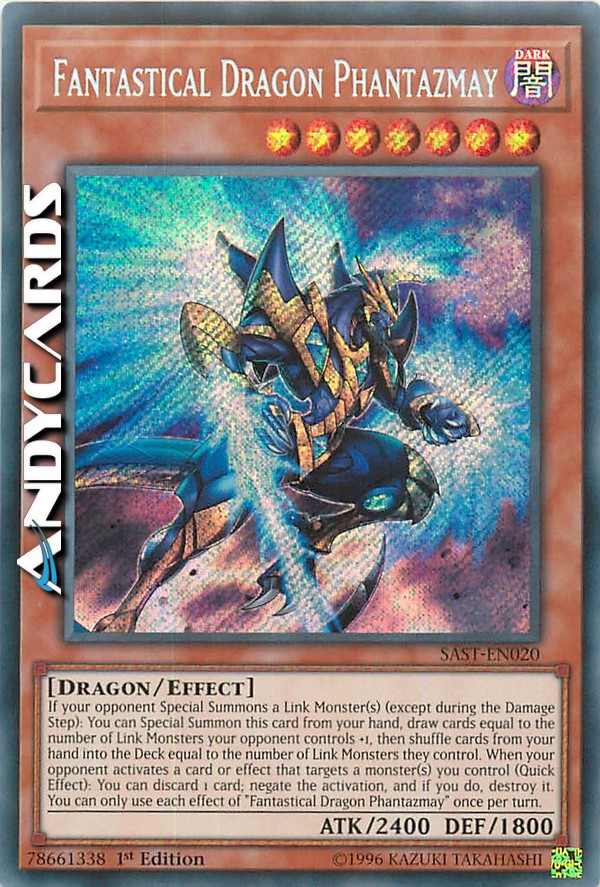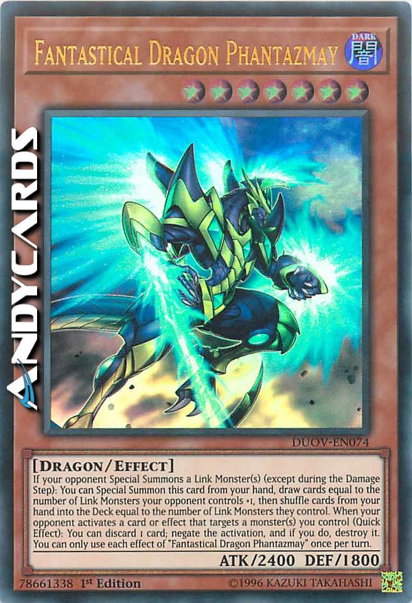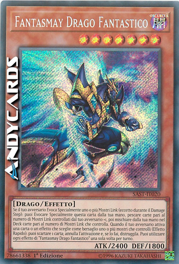 Se il tuo avversario Evoca Specialmente uno o più Mostri Link (eccetto durante il Damage Step): puoi Evocare Specialmente questa carta dalla tua mano, pescare carte pari al numero di Mostri Link controllati dal tuo avversario +1, poi mischiare dalla tua mano nel Deck carte pari al numero di Mostri Link che controlla. Quando il tuo avversario attiva una carta o un effetto che sceglie come bersaglio uno o più mostri che controlli (Effetto Rapido): puoi scartare 1 carta; annulla l'attivazione e, se lo fai, distruggila. Puoi utilizzare ogni effetto di "Fantasmay Drago Fantastico" una sola volta per turno.