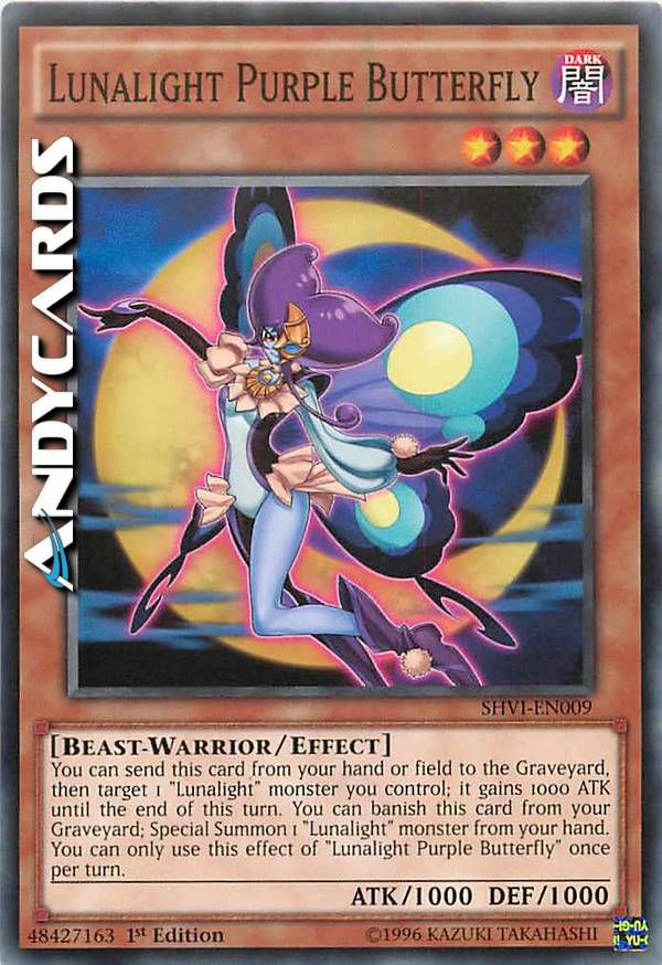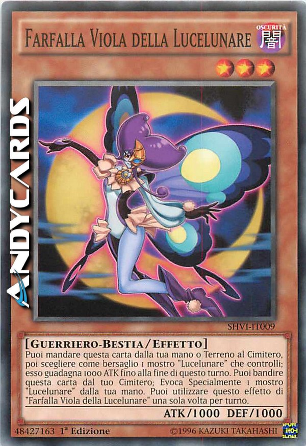 Puoi mandare questa carta dalla tua mano o Terreno al Cimitero, poi scegliere come bersaglio 1 mostro "Lucelunare" che controlli; esso guadagna 1000 ATK fino alla fine di questo turno. Puoi bandire questa carta dal tuo Cimitero; Evoca Specialmente 1 mostro "Lucelunare" dalla tua mano. Puoi utilizzare questo effetto di "Farfalla Viola della Lucelunare" una sola volta per turno.