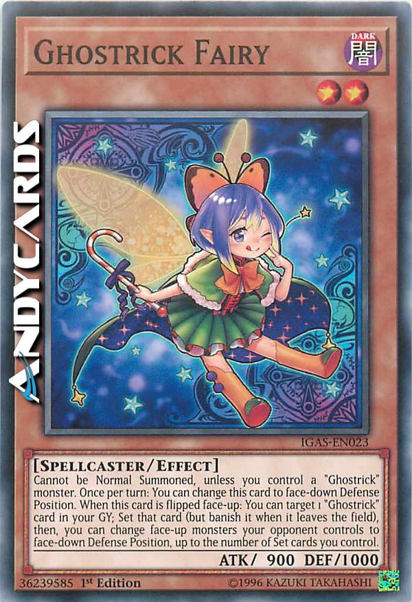 Cannot be Normal Summoned, unless you control a "Ghostrick" monster. Once per turn: You can change this card to face-down Defense Position. When this card is flipped face-up: You can target 1 "Ghostrick" card in your GY; Set that card (but banish it when it leaves the field), then, you can change face-up monsters your opponent controls to face-down Defense Position, up to the number of Set cards you control.