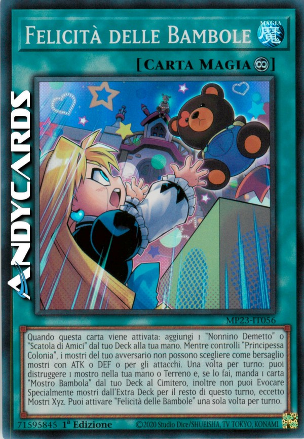 Quando questa carta viene attivata: aggiungi 1 "Nonnino Demetto" o "Scatola di Amici" dal tuo Deck alla tua mano. Mentre controlli "Principessa Colonia", i mostri del tuo avversario non possono scegliere come bersaglio mostri con ATK o DEF 0 per gli attacchi. Una volta per turno: puoi distruggere 1 mostro nella tua mano o Terreno e, se lo fai, manda 1 carta "Mostro Bambola" dal tuo Deck al Cimitero, inoltre non puoi Evocare Specialmente mostri dall'Extra Deck per il resto di questo turno, eccetto Mostri Xyz. Puoi attivare "Felicità delle Bambole" una sola volta per turno.