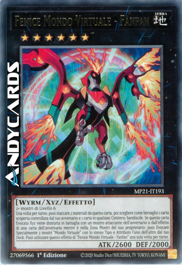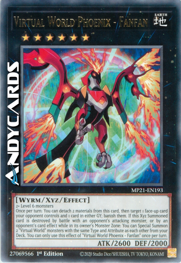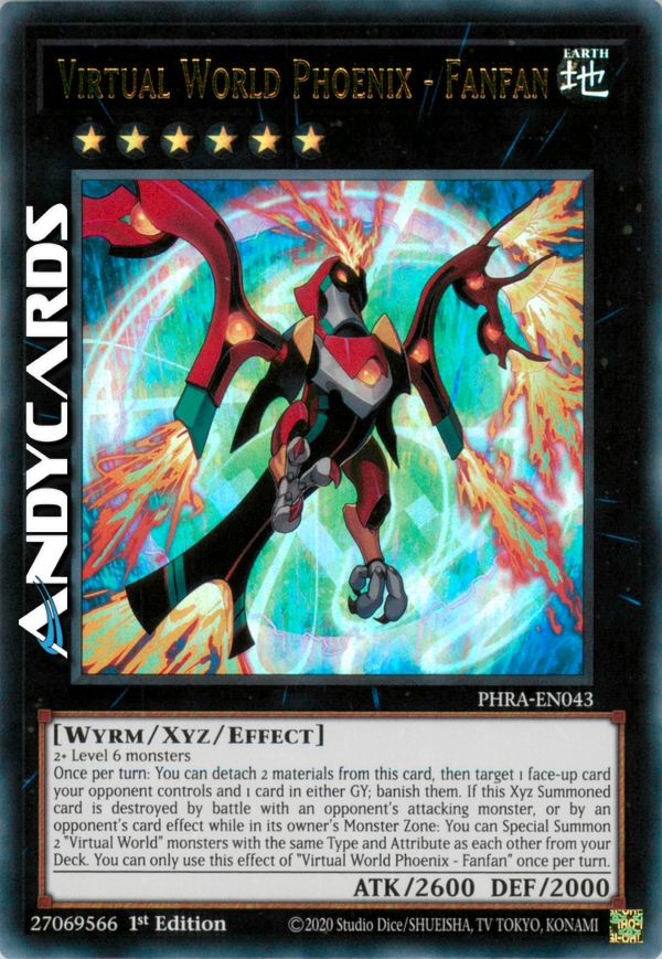 Una volta per turno: puoi staccare 2 materiali da questa carta, poi scegliere come bersaglio 1 carta scoperta controllata dal tuo avversario e 1 carta in qualsiasi Cimitero; bandiscile. Se questa carta Evocata Xyz viene distrutta in battaglia con un mostro attaccante dell'avversario o dall'effetto di una carta dell'avversario mentre è nella Zona Mostri del suo proprietario: puoi Evocare Specialmente 2 mostri "Mondo Virtuale" con lo stesso Tipo e Attributo l'uno dell'altro dal tuo Deck. Puoi utilizzare questo effetto di "Fenice Mondo Virtuale - Fanfan" una sola volta per turno.