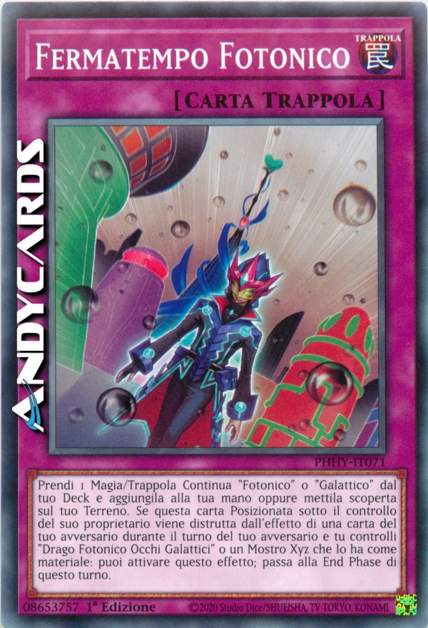Prendi 1 Magia/Trappola Continua "Fotonico" o "Galattico" dal tuo Deck e aggiungila alla tua mano oppure mettila scoperta sul tuo Terreno. Se questa carta Posizionata sotto il controllo del suo proprietario viene distrutta dall'effetto di una carta del tuo avversario durante il turno del tuo avversario e tu controlli "Drago Fotonico Occhi Galattici" o un Mostro Xyz che lo ha come materiale: puoi attivare questo effetto; passa alla End Phase di questo turno.
