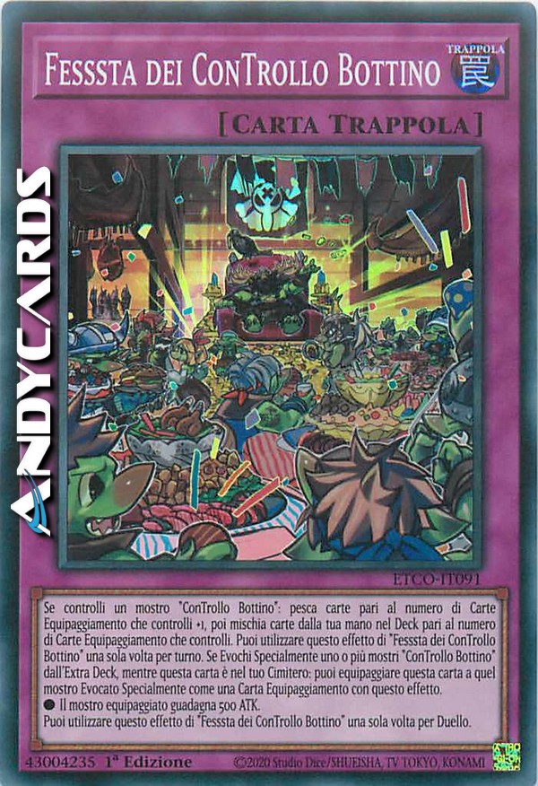 Se controlli un mostro "ConTrollo Bottino": pesca carte pari al numero di Carte Equipaggiamento che controlli +1, poi mischia carte dalla tua mano nel Deck pari al numero di Carte Equipaggiamento che controlli. Puoi utilizzare questo effetto di "Fesssta dei ConTrollo Bottino" una sola volta per turno. Se Evochi Specialmente uno o più mostri "ConTrollo Bottino" dall'Extra Deck, mentre questa carta è nel tuo Cimitero: puoi equipaggiare questa carta a quel mostro Evocato Specialmente come una Carta Equipaggiamento con questo effetto.
